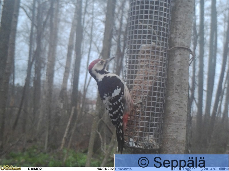 Kangasala Saarikylät Riistakamera kuvasi käpytikan ruokinnalta.
