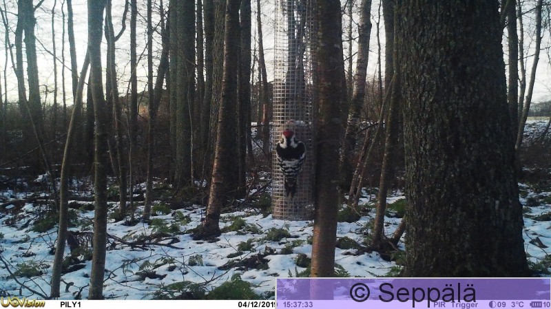 Pälkäne Myttäälä Riistakamera kuvasi valkoselkätikan ruokinnalta.