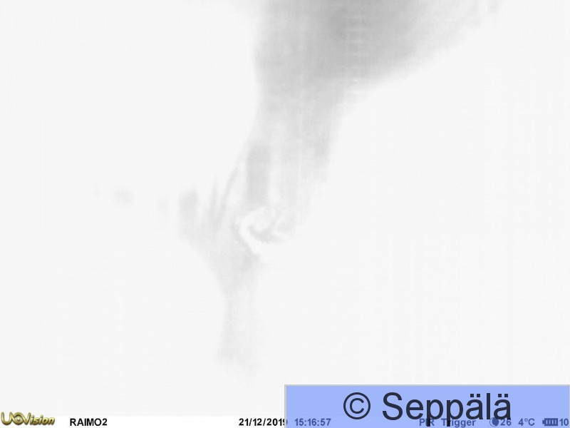 Pälkäne Myttäälä Kun aivan kameran edessä on oksia, salaman välähdys ylivalottaa ne ja kuva näyttää valkoiselta. Tässä kamera on kuvannut hämärissä valkoselkätikan kuten posken kuvioista näkee.