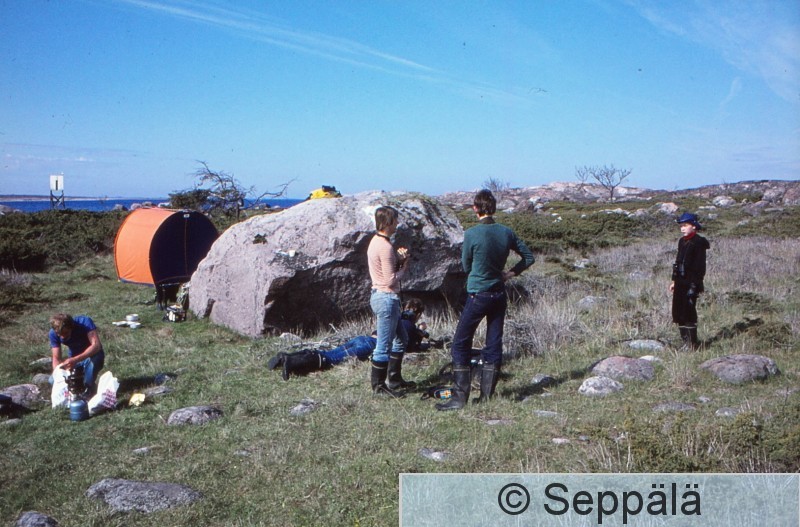 Kökar Sammon yhteislyseon luontokerho Kuorga teki toukokuun lopulla 1976 jokakeväisen 5 vrk kevätretkensä Nauvon Kökariin ja Jurmoon. Tässä ollaan paluumatkalla Kökarissa. Kohta nähtiin taivaalla mustahaikara.