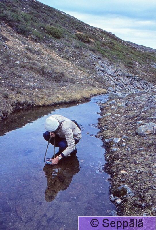 Utsjoki Ailigas Lasse Kosonen täyttää juomaleiliä Ailigas-tunturilla, missä retkeilimme kolmistaan ennen kuin vaelsimme luonnonpuiston läpi heinäkuussa 1975.