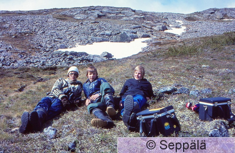 Utsjoki Ailigas Lasse Kosonen, Teppo Rantanen ja minä Ailigaksen rinteillä heinäkuussa 1975. Kuva otettu itselaukaisimella.