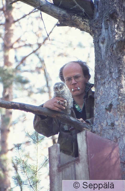 Ylöjärvi Martti Lagerström lehtopöllön pöntöllä Näsijärven saaressa. Emo oli lentänyt pois saaresta, siksi ei kypärää.