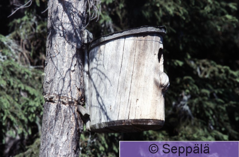 Ikaalinen Luhalahti Sipsiöjärvi Rautalangalla kiinnitetty telkänpönttö ja rautalanka on uponnut syvälle männyn sisään puun kasvaessa.