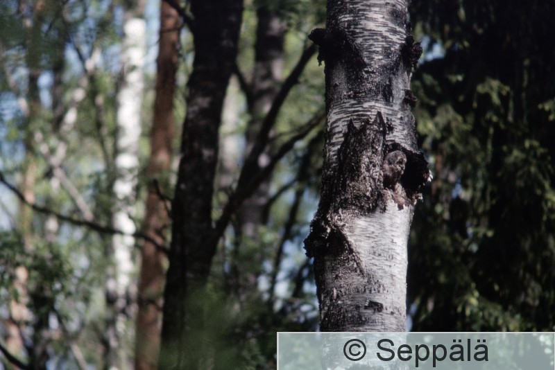Parikkala Saari Naattikumpu Lehtopöllön poikanen katselee koivun kyljessä olevasta pesästä.