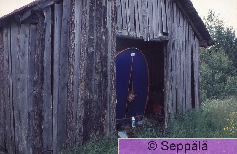 Kainuu Matti Hankela (kuvassa; edesmennyt), Lasse Kosonen ja Raimo Seppälä retkeilivät Kainuussa 1. lintuatlaksen kartoitustyössä n. 1.-15.7.1976. Kyllästyimme vesisateessa telttailemiseen, joten pystytimme telttamme latoon, mistä maanomistaja hääti meidät pois pari päivää myöhemmin.