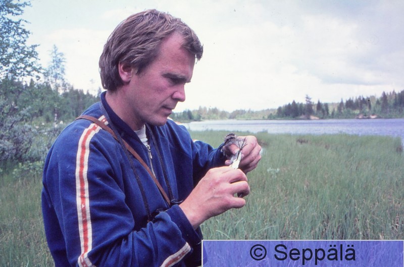 Kainuu Matti Hankela (kuvassa; edesmennyt), Lasse Kosonen ja Raimo Seppälä retkeilivät Kainuussa 1. lintuatlaksen kartoitustyössä n. 1.-15.7.1976. Matti rengastaa liron poikasta.