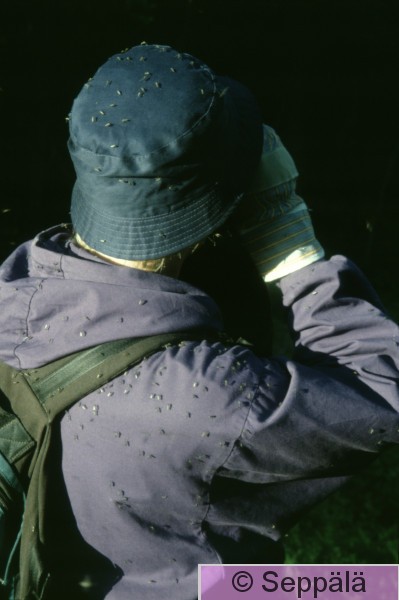 Kuusamo Närängänvaara Retkeilimme reilun viikon Kuusamossa, ja pari päivää Närängänvaaralla. Kuvassa Petri Seppälä ja sääskiä.