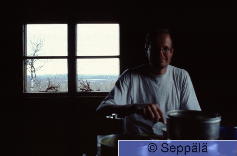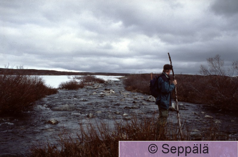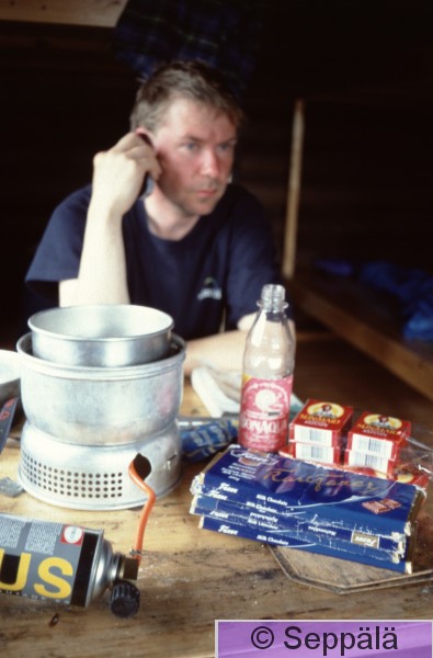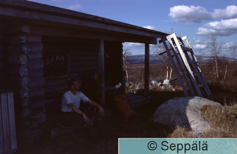 Enontekiö Käsivarren erämaa Buvrrasjohkan kämppä Raimo Seppälä Buvrrasjohkan kämpällä, kuvaaja Petri Seppälä. Retkeilimme Käsivarren erämaassa kaksi viikkoa kesäkuun alussa 2003.
