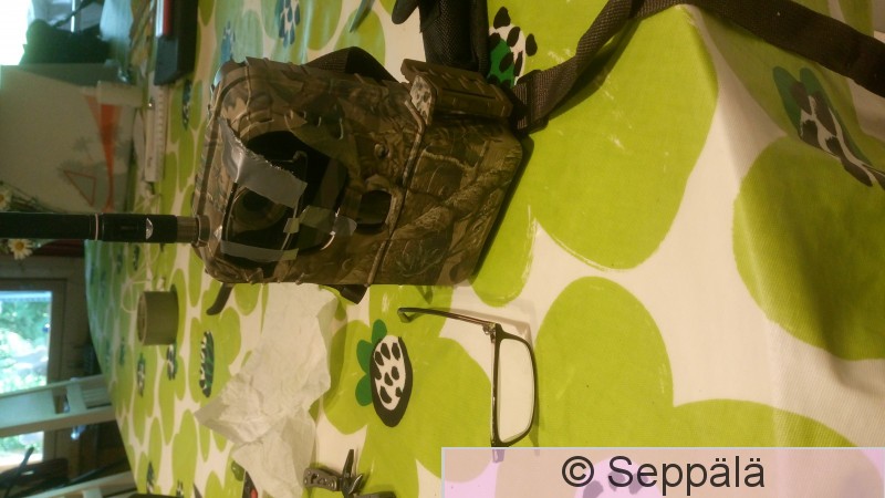 Kangasala Saarikylät Riistakameran säätämistä lähikuvaukseen. Teippasin objektiivin eteen halpojen lukulasien linssin.