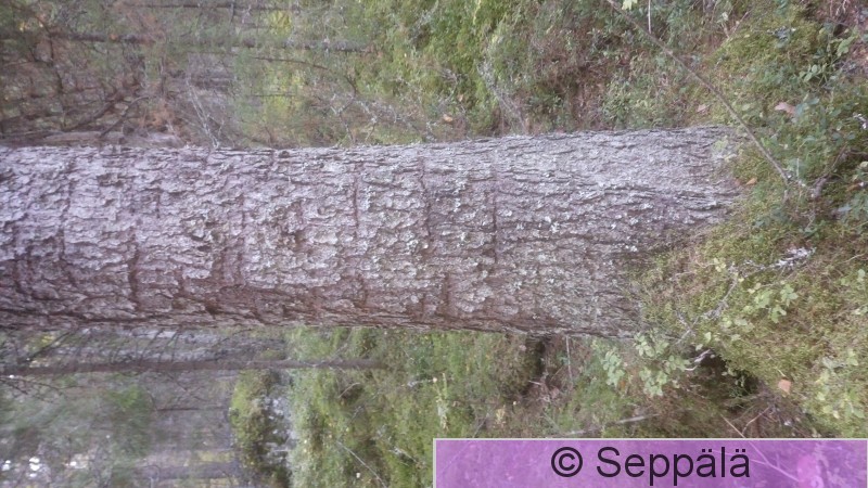 Pälkäne Laipanmaa Pikku-Kaila Pohjantikka on naputellut kuuseen tyypillisiä reikärivejään.