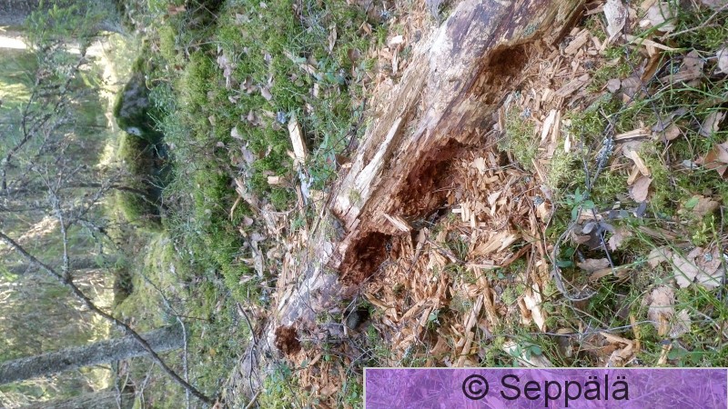 Pälkäne Äimälä Mustanlahdenmäen luonnonsuojelualue Palokärki on kaivanut hyönteisiä lahopuusta.