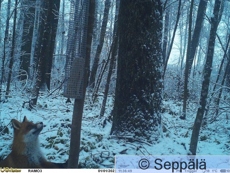 Pälkäne Myttäälä Kettu haikailee valkoselkätikkaruokinnan rasvamakkaraa.