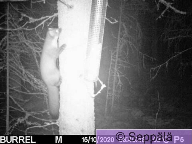 Mänttä-Vilppula Näätä on vakiovieras kuukkeliruokinnoilla öisin. Yleensä se lähtee heti pois, koska ei saa ruokintalaitteesta mitään.
