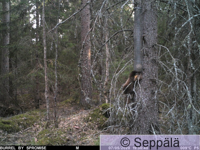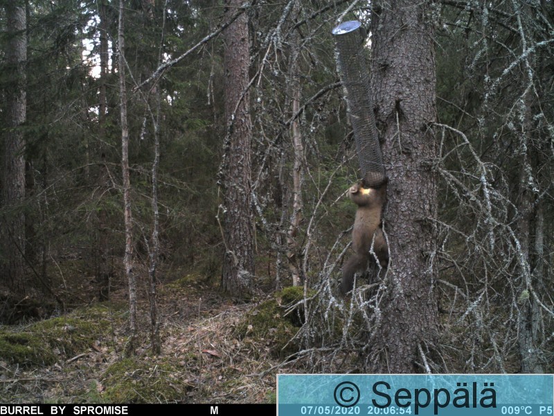 Juupajoki, Huikonjoki Näätä yrittää repiä kuukkeliruokinnan maahan (5 kuvaa), mutta turvavaijeri estää ruokintalaitteen putoamisen.