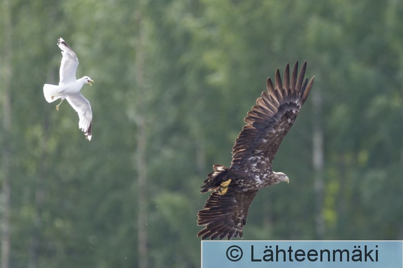 Sastamala Mouhijärvi Salmi Kalalokki härnää nuorta merikotkaa