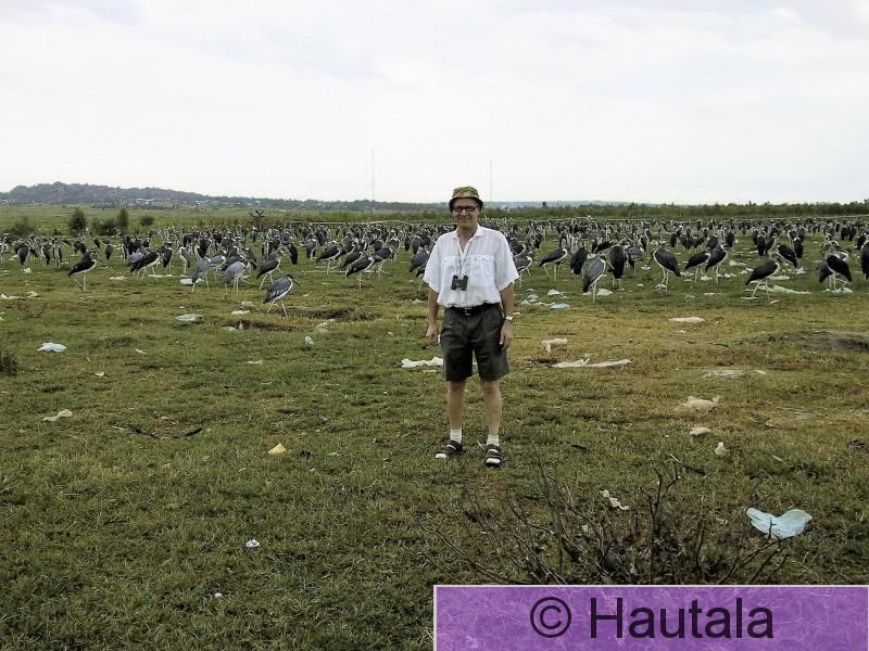 Tansania Kuvaaja satojen afrikanmarabuhaikaroiden ym. lintujen ympäröimänä.
