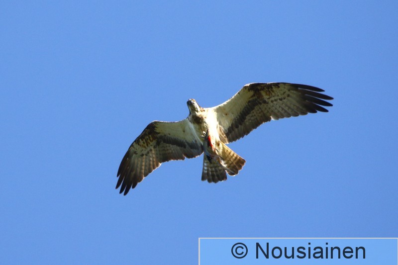 Kangasala Pohtiolampi Sääksi on saanut kynsiinsä kaksi kalaa kerrallaan.