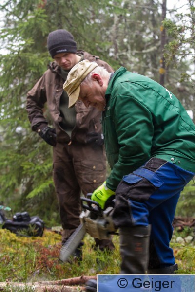 Kangasala Heponiemi Sääksisäätion toiminnanjohtaja Juhani Koivu sahaa kuusenrankoja sääksen tekopesää varten. Taustalla Joona Koskinen.