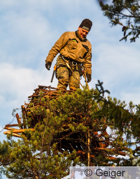 Kangasala Heponiemi Harri Koskinen testaa juuri valmistuneen sääksen tekopesän tukevuutta nousemalla sen päälle seisomaan.