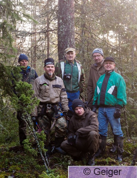 Kangasala Heponiemi Sääksen tekopesän rakentajaporukka pesäpuun juurella, Vasemmalta oikealle: Jyrki Savolainen, Harri Koskinen, Juhani Koivu, Joona Koskinen, Heikki Kainulainen ja Simo Loisa.