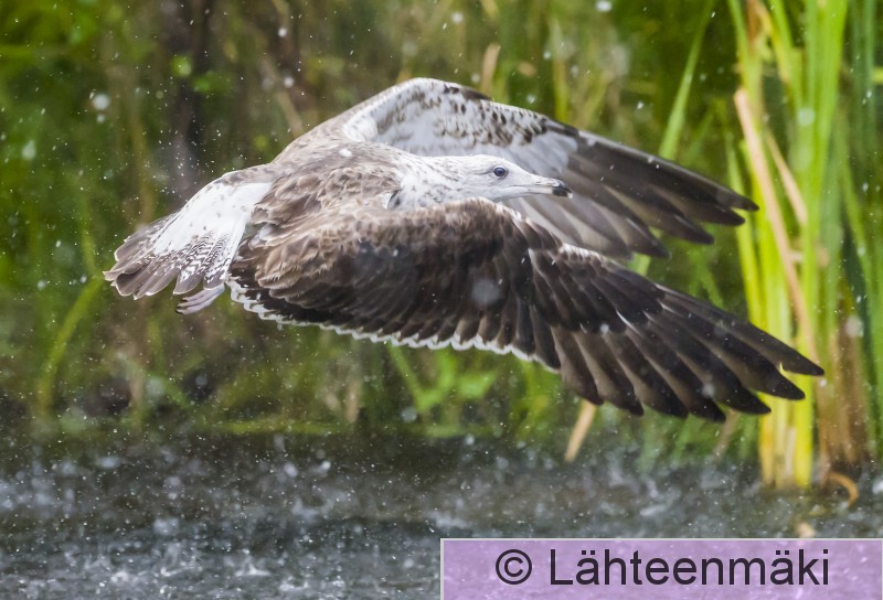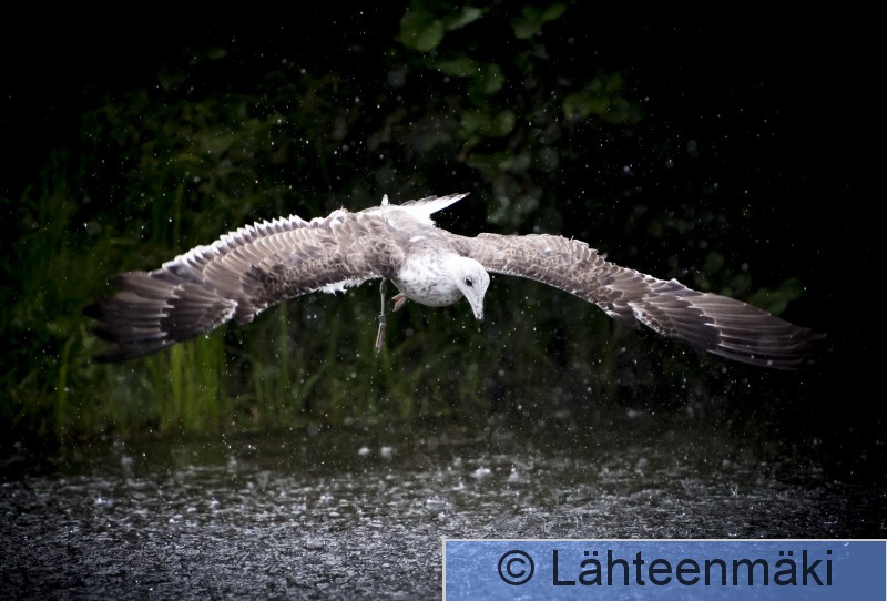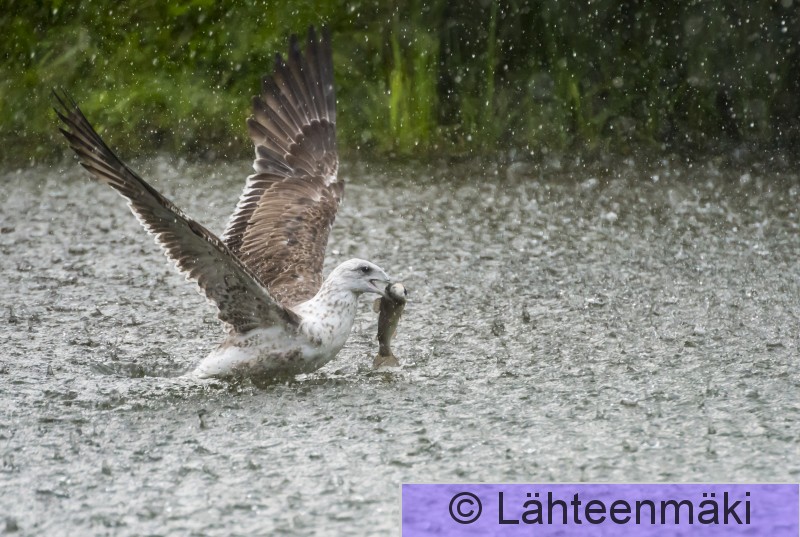 4196 Selkälokki, Larus fuscus, kalastaa, sade, ukkoskuuro, vaakakuva