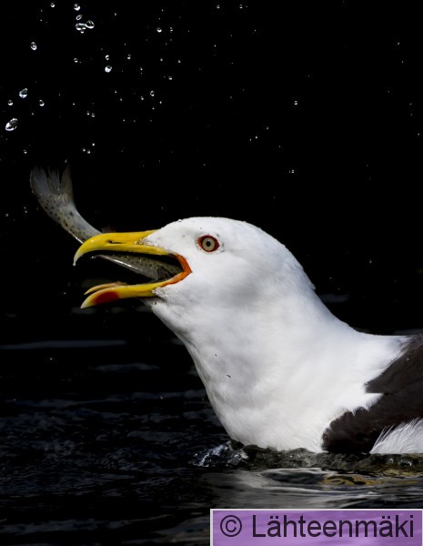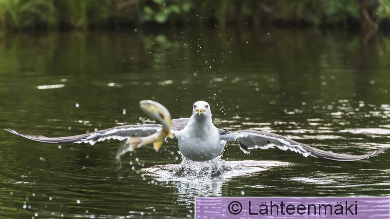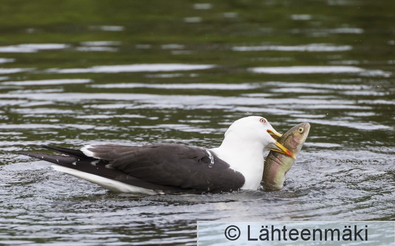 4019 Selkälokki, Larus fuscus, kalastaa, kala, kirjolohi, vaakakuva