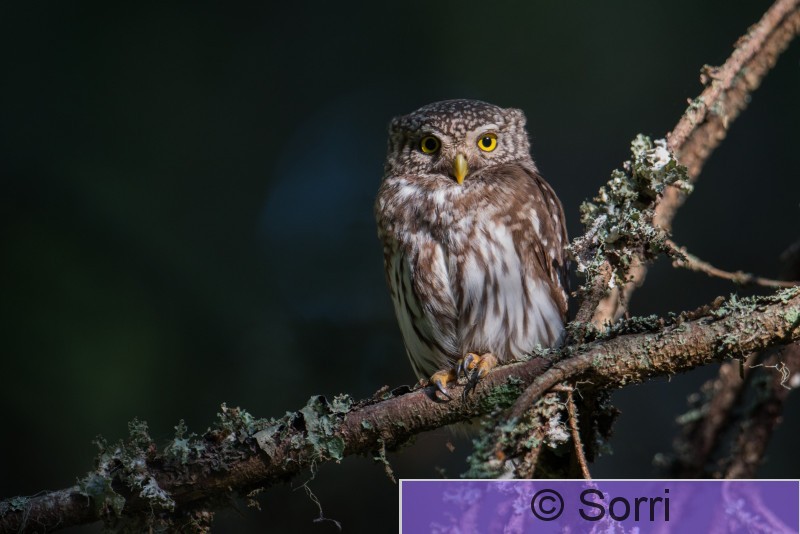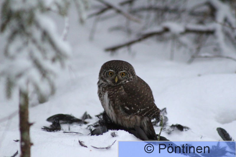 Suolijärven luontopolku, Ahvenisjärventien lähellä Varpuspöllö oli napannut saaliikseen mustarastaan lintujen ruokintapaikalla. Pöllö oli pienempi kuin saaliinsa. Pöllöllä näytti olevan kova nälkä, myyriä se ei ollut onnistunut saaliikseen saamaan.
