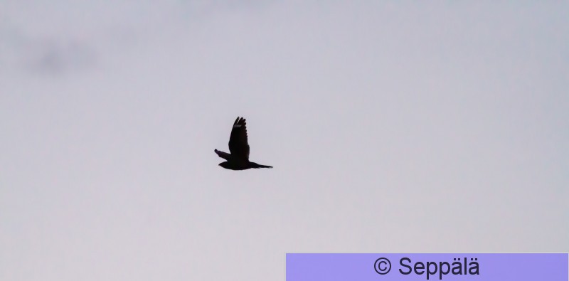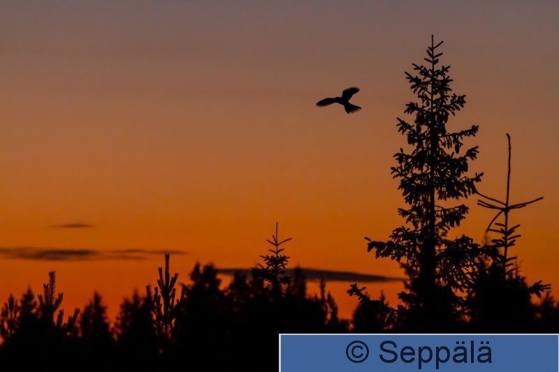 Ruovesi Siikakangas Kehrääjä lentää yötaivaalla, siluettikuva.