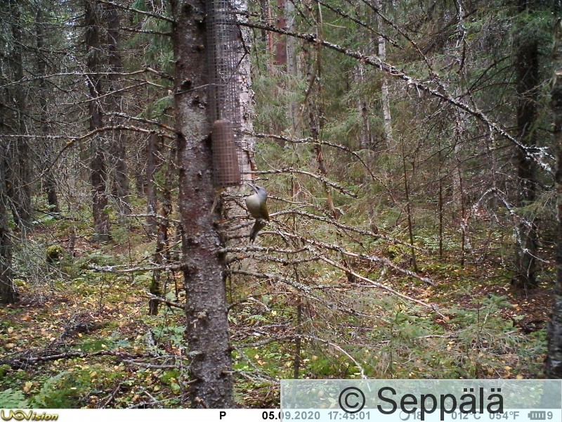 Mänttä-Vilppula Harmaapäätikka metsäruokinnalla. Riistakamera kuvasi.