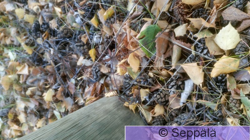 Kangasala Saarikylät Apajapohja Käpytikan käsittelemiä männynkäpyjä työpajan alla.
