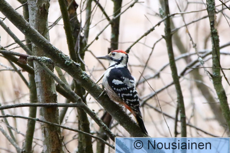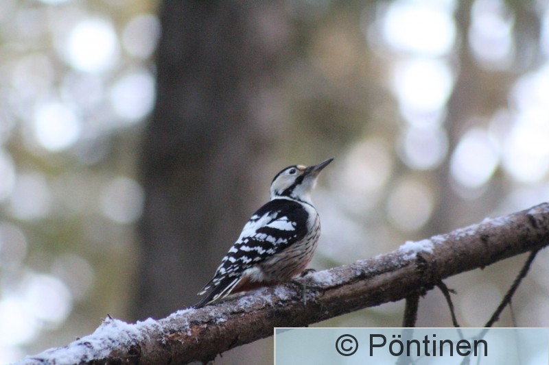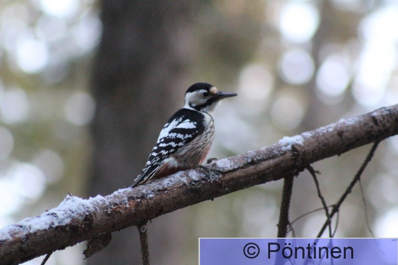 Hervanta, Suolijärven luontopolun metsikkö Lintujen ruokintapaikalle ilmestyi valkoselkätikka. Se katseli ensin paikkaa puunoksalla istuen. Sitten kun se totesi paikan turvalliseksi, se lensi maahan napostelemaan talisiemenpötkön palasia.