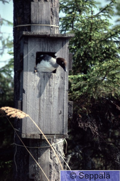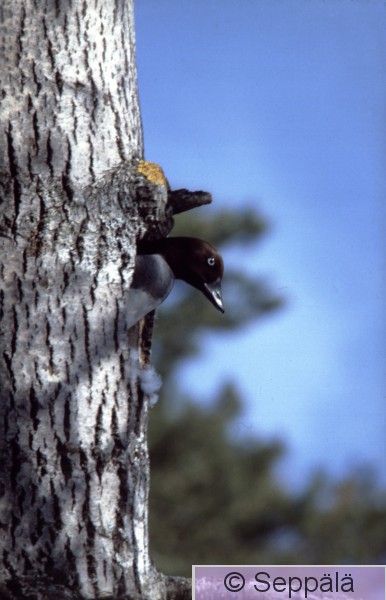 Ikaalinen Luhalahti Sipsiöjärvi Telkkä lähdössä pesästään, joka on vanhassa palokärjenkolossa rantahaavassa.