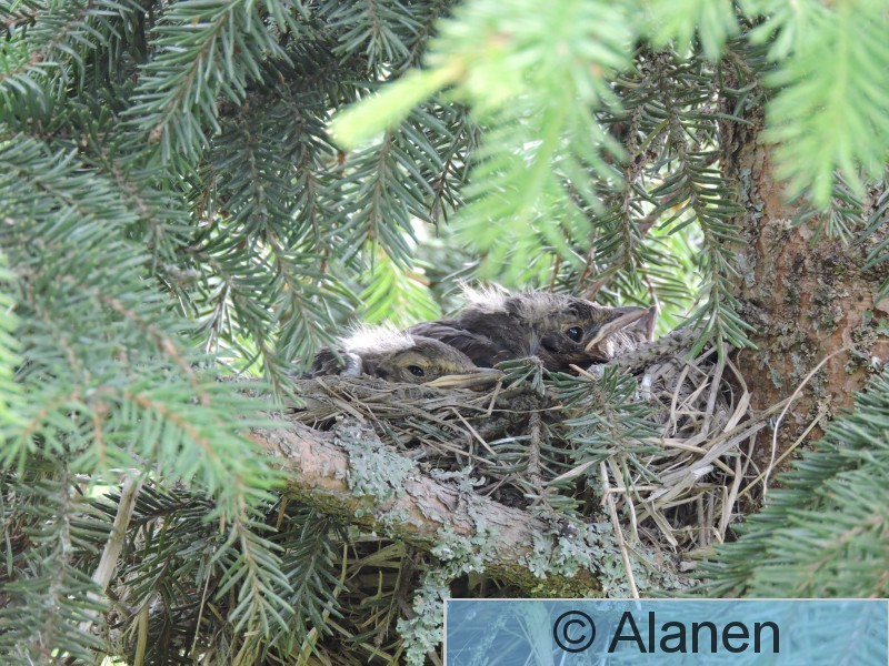 Sastamala Salmi Räkättirastaspoikue kerjää ruokaa rauduskoivussa sijaitsevassa pesässä. Emo on pesän äärellä.