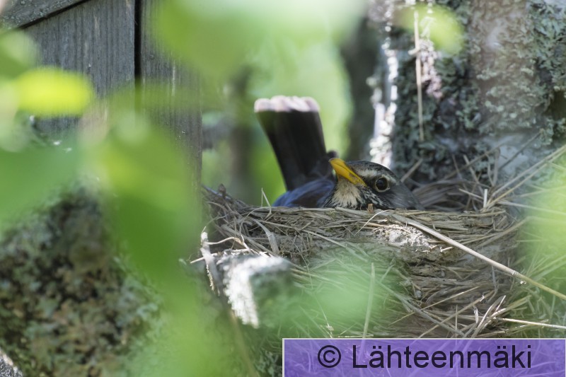 Sastamala Salmi Räkättirastaspoikue kerjää ruokaa rauduskoivussa sijaitsevassa pesässä. Emo on pesän äärellä.