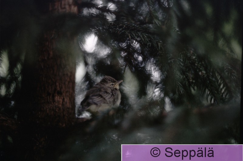 Raasepori Rågö Kultarinnan juuri pesästä lähtenyt poikanen kuusen sisällä.