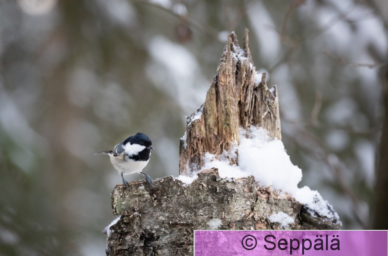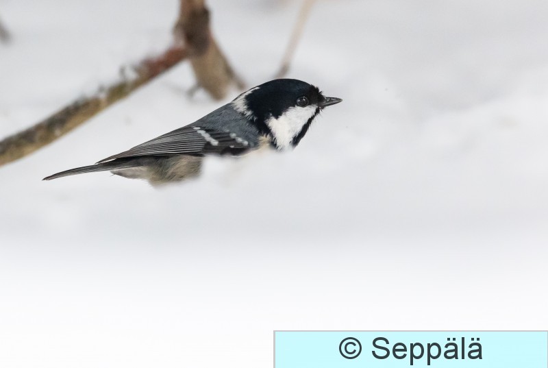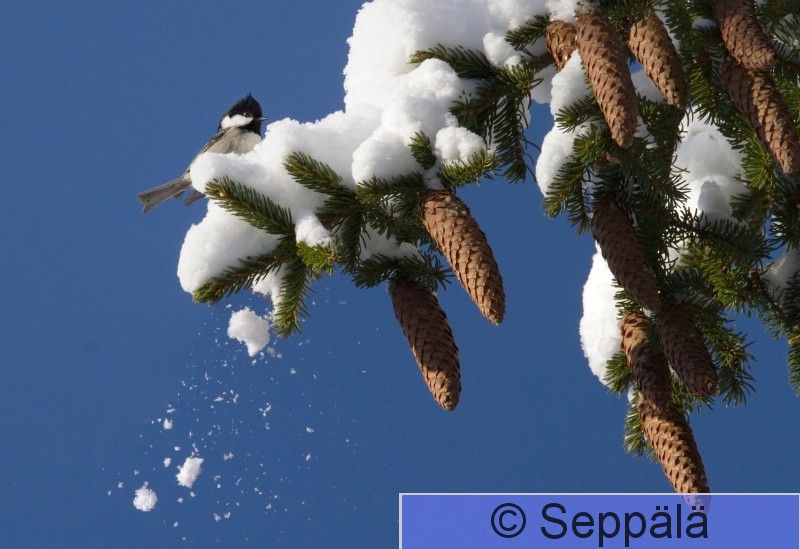 Ylöjärvi Kuru Kuusitiainen lumisella kuusenoksalla