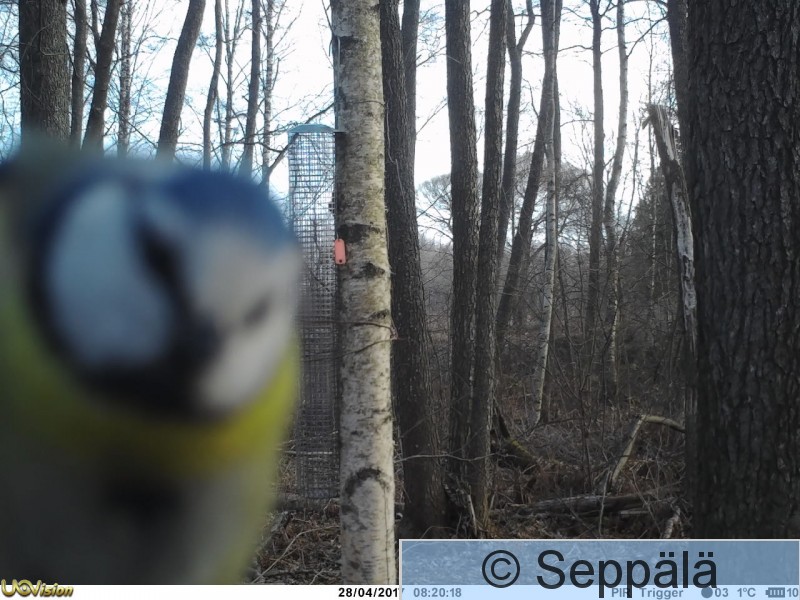 Pälkäne Myttäälä Sinitiainen tutkii riistakameran kuvausaukkoa keväällä pesäkolon etsinnän yhteydessä.