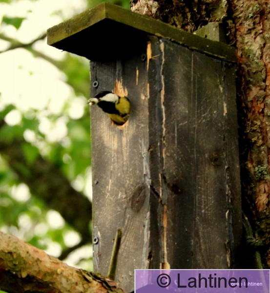 Kotipihasta Talitiaisella ruokaa vietäväksipihapiirissä olevalle linnunpöntölle.