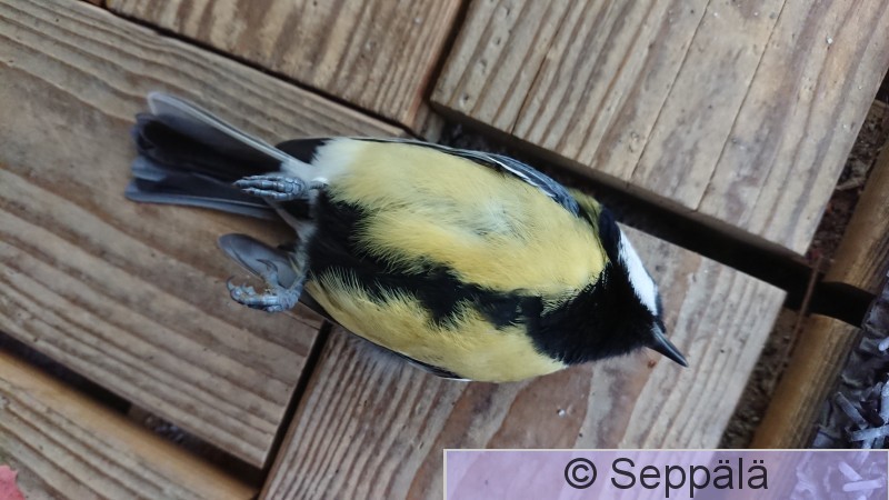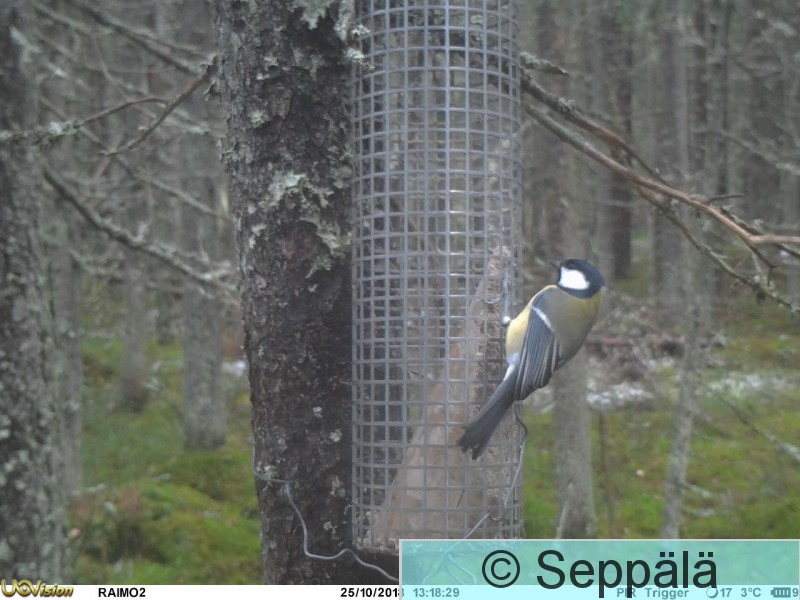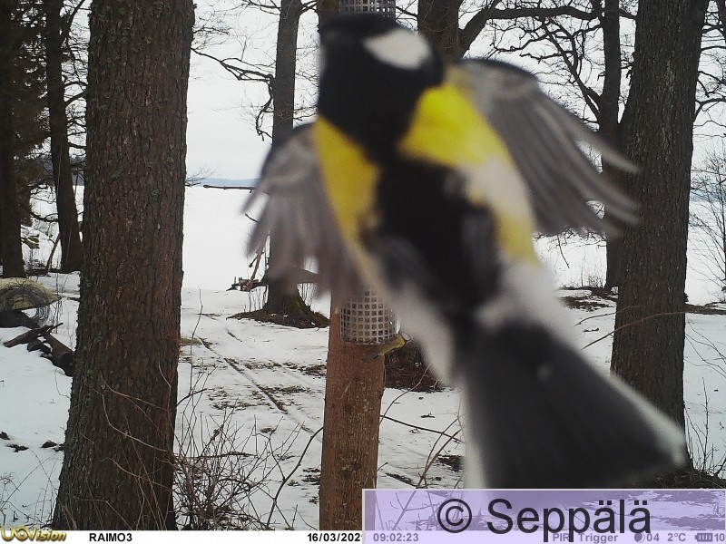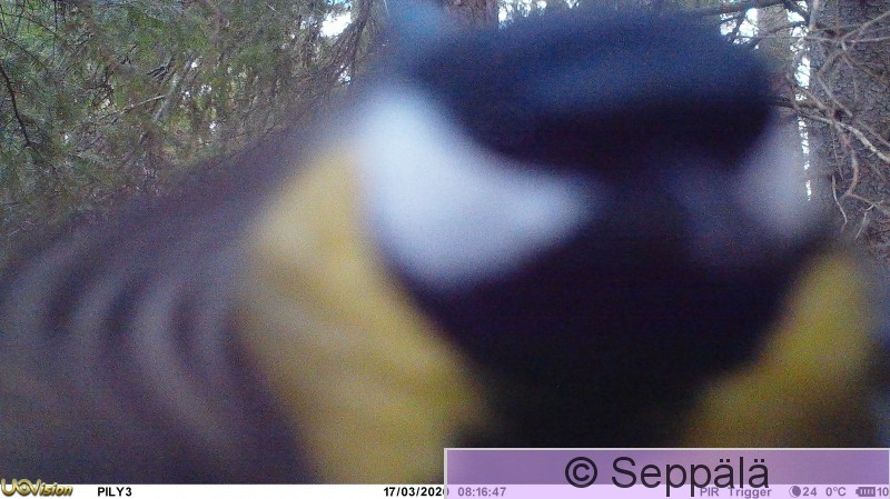 Kangasala Saarikylät Talitiainen tulossa tutkimaan riistakameran pyöreää linssiä.