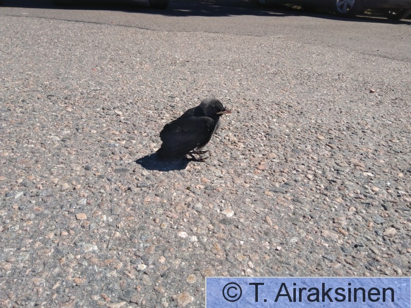 Hyvinkää Lentokyvytön naakan poikanen asfaltilla. Emo seurailee vieressä.