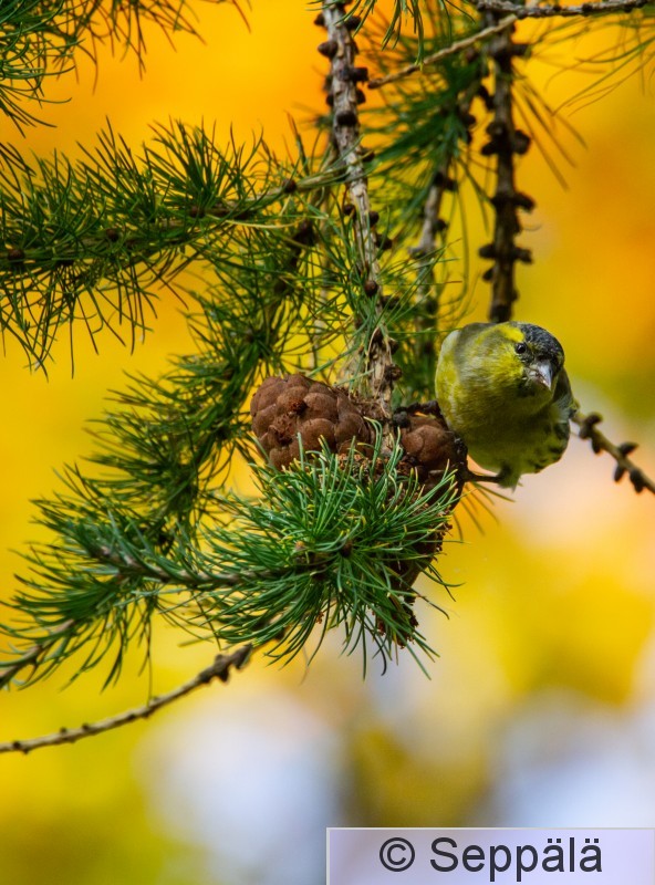 Tampere Iidesjärvi Koiras vihervarpunen etsii syötävää lehtikuusesta, taustalla syksyn keltainen vaahtera.