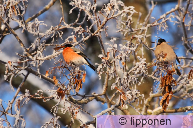 Tampere Hatanpää Arboretum Vaahteran siemenet luomuruokana 17 C pakkasessa.