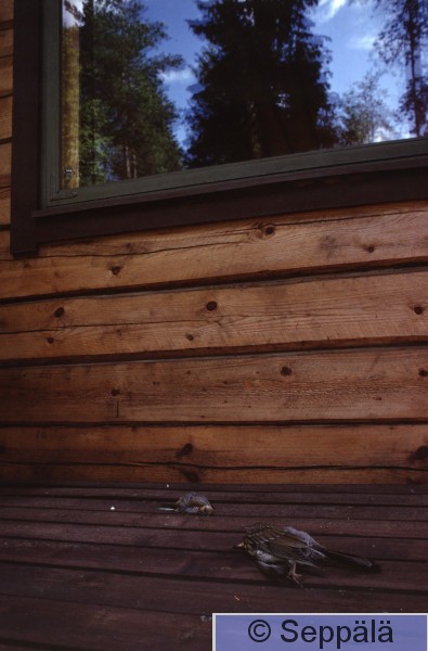 Ikaalinen Luhalahti Pääniemi Räkättirastas ja jokin muu lintu on törmännyt ikkunaan, koska siitä heijastuu metsä.