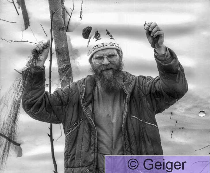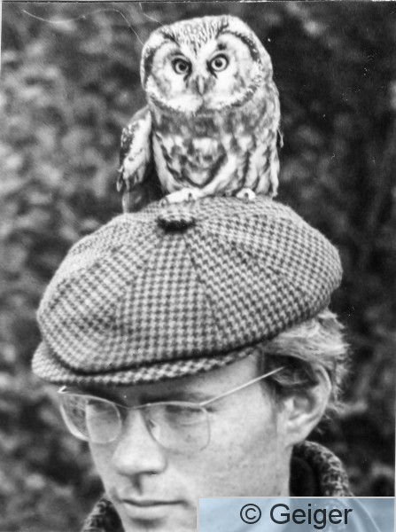 ? Huom: kuvaaja J. Savolainen, julkaisulupa on.Helmipöllö Martti Lagerstömin päässä. Vuosi n. 1970.