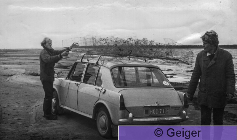 Siikajoki Ulkonokka Huom: kuvaaja J. Savolainen, julkaisulupa on. PVM ei tarkka, syyskuu 1968. Juhani kahlaaja Vuorinen ja Martti Lagerström purkavat kahlaakatiskoita Morris Milerin kyydistä.