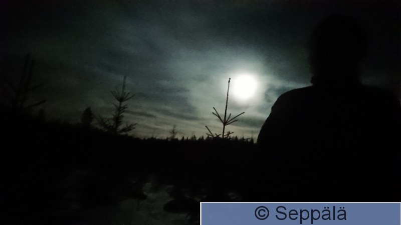 Virrat Karhu tuli kuukkeliruokinnalle, käänsi ruokintalaitteen ylösalaisin, repäisi kannen auki ja vei rasvan. Riistakameran kuva on tumma, mutta lähellä oleva karhun naama ja vähän käpälää erottuvat hyvin. Kuva Jouko Hakala.