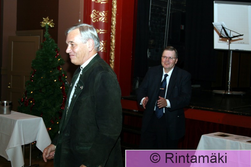 Tampere Olavi Kalkko saa ansiomerkin/ikuisuusjäsenyyden PiLY:n 40-vuotisjuhlassa. Taustalla yhdistyksen pj. Jukka T. Helin.