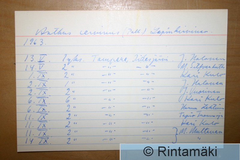 Tampere Hatanpään arkisto Tyypillinen Aimo Olavi Salosen täyttämä havaintokortti tässä tapauksessa lapinkirvistä koskien.