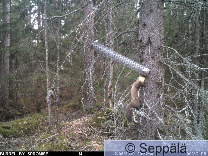Juupajoki, Huikonjoki Näätä yrittää repiä kuukkeliruokinnan maahan (5 kuvaa), mutta turvavaijeri estää ruokintalaitteen putoamisen.
